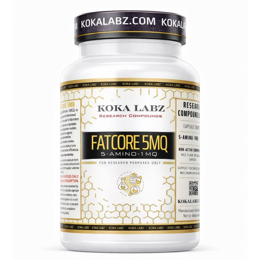 Fatcore 5MQ by Koka Labz is a precision-dosed research compound delivering 50 mg of 5-Amino-1MQ per capsule. Provided in a 60-capsule format, it offers convenience and consistency for scientific exploration of metabolic mechanisms involving nicotinamide N-methyltransferase (NNMT) — an enzyme currently under study for its possible role in fat metabolism, energy regulation, and age-related muscle changes.