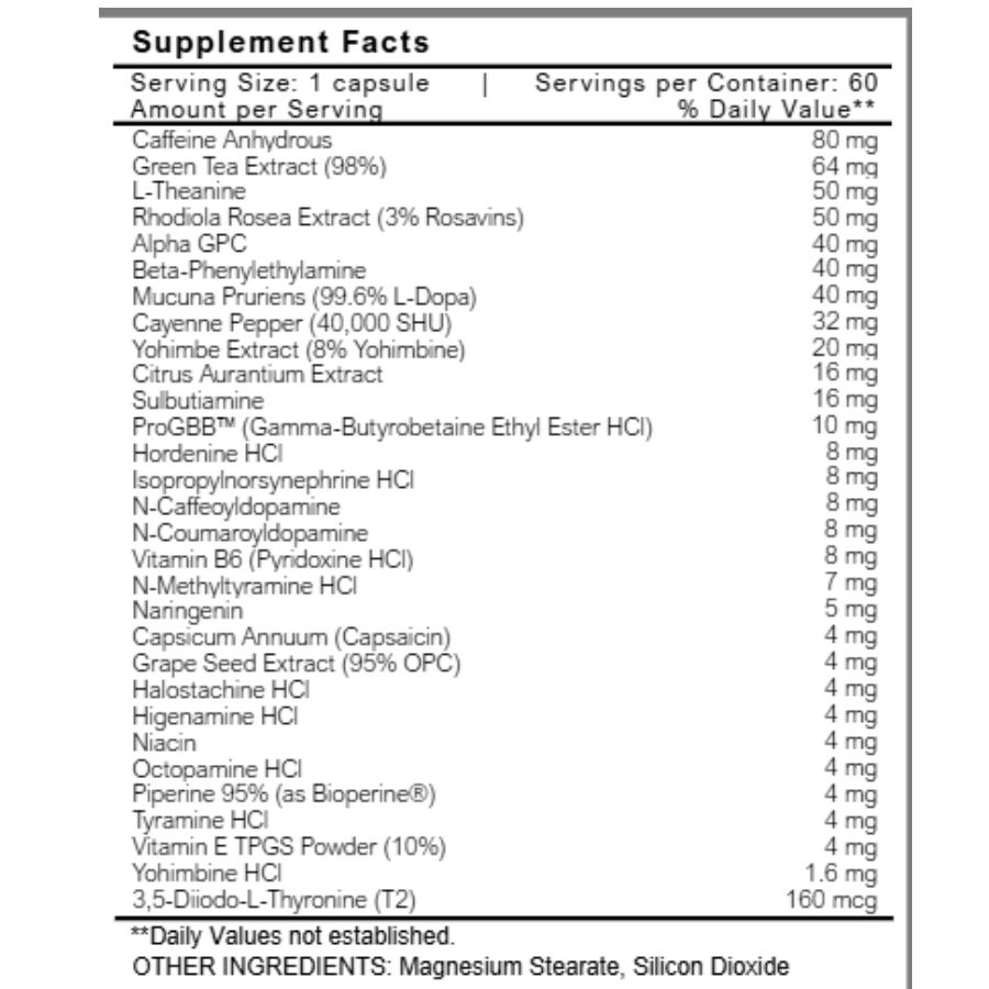 Includes high-grade green tea extract (98%), Citrus Aurantium, ProGBB®, hordenine HCL, higenamine HCL, halostachine HCL and additional thermogenic agents.
